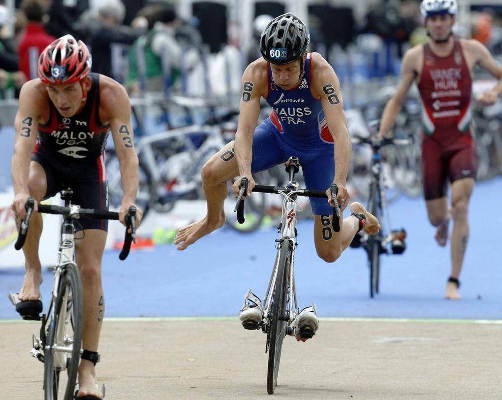 世界铁人三项赛中,游泳起点的排位决定了进入自行车段的先手优势。